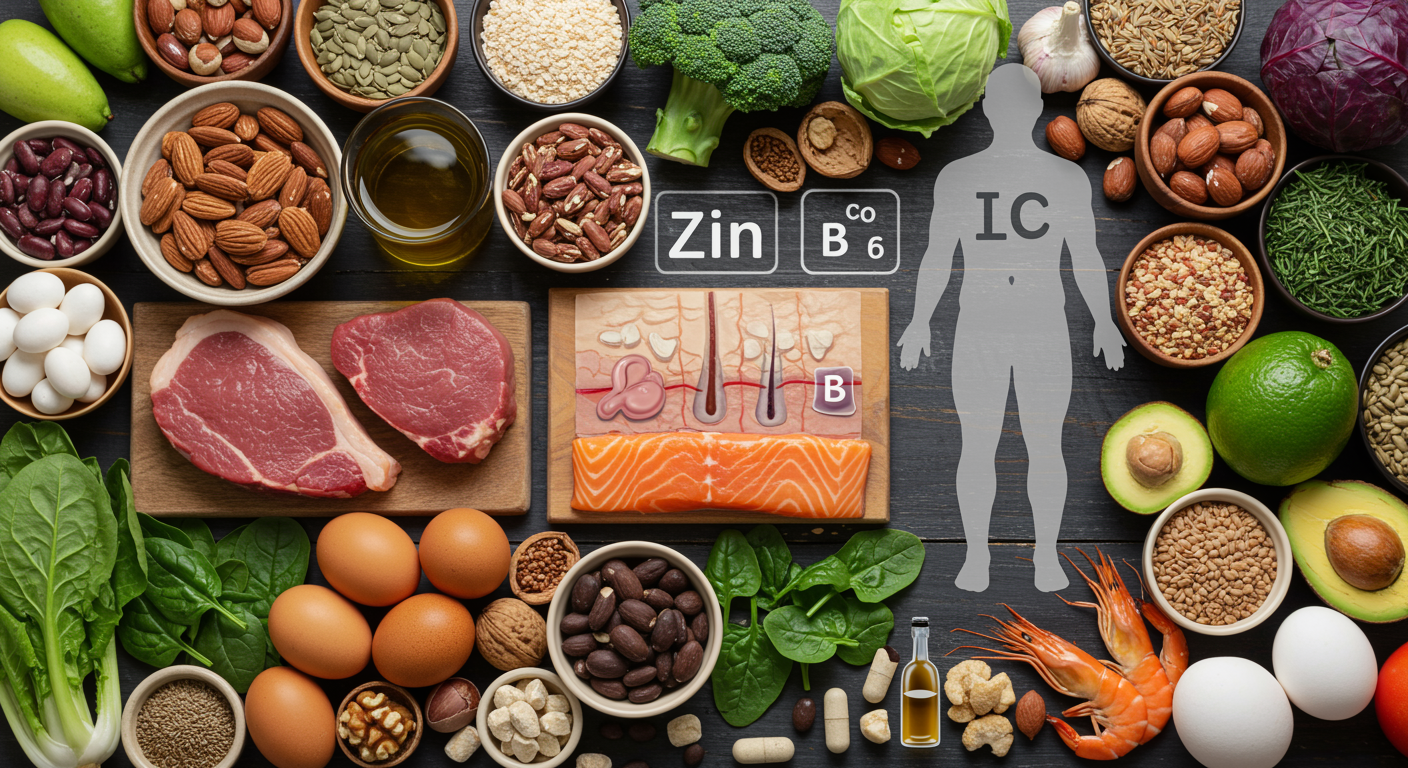 Witamina B6 (pirydoksyna) również odgrywa ważną rolę, ponieważ pomaga w transporcie cynku do komórek i jego lepszym wykorzystaniu przez organizm. Badania sugerują, że synergiczne działanie cynku i witaminy B6 może być bardziej efektywne w łagodzeniu niektórych objawów niedoboru cynku, takich jak osłabiona odporność, problemy ze Skórą, Włosami, Paznokciami czy zaburzenia zmysłów smaku i węchu. Cynk wspiera zmysły smaku i węchu. Cynk jest kluczowy dla mocnych włosów. Potas, Miedź, Żelazo i Magnez, inne ważne Mikroelementy, również współpracują z cynkiem w wielu procesach komórkowych, a ich równowaga jest kluczowa dla zdrowia. Cynk i selen wzajemnie się uzupełniają. Zadbana flora bakteryjna jelit (mikrobiota) także wpływa na wchłanianie minerałów, w tym cynku, dlatego probiotyki i prebiotyki mogą pośrednio wspierać jego przyswajanie oraz prawidłowe funkcje, co pomaga w walce z niedoborem cynku.